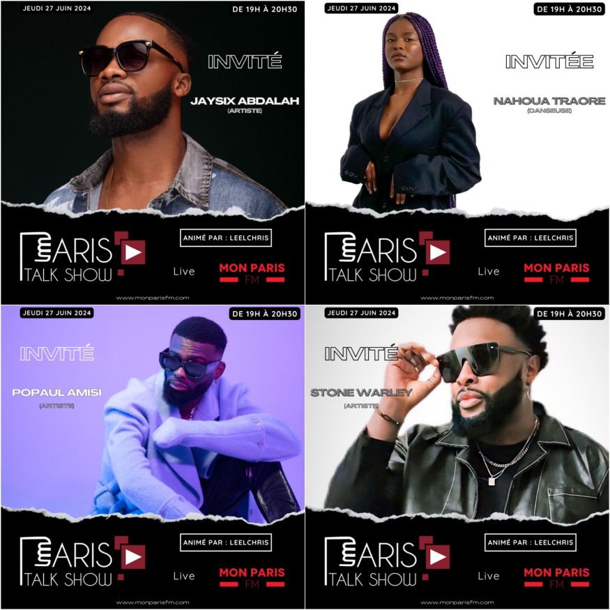 Ce Jeudi dans le Paris Talk Show on reçoit pour la dernière de la saison, les artistes Jaysix Abdalah, Popaul Amisi, Stone Warley, la danseuse Nahoua Traore alias Black Woman et Tya de LaMif'.
